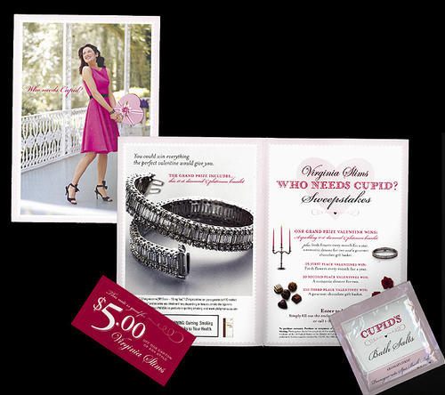 Direct mail from Virinia Slims with Valentine's Day theme. Cover features image of woman in pink dress with the text, "Who needs Cupid?"
