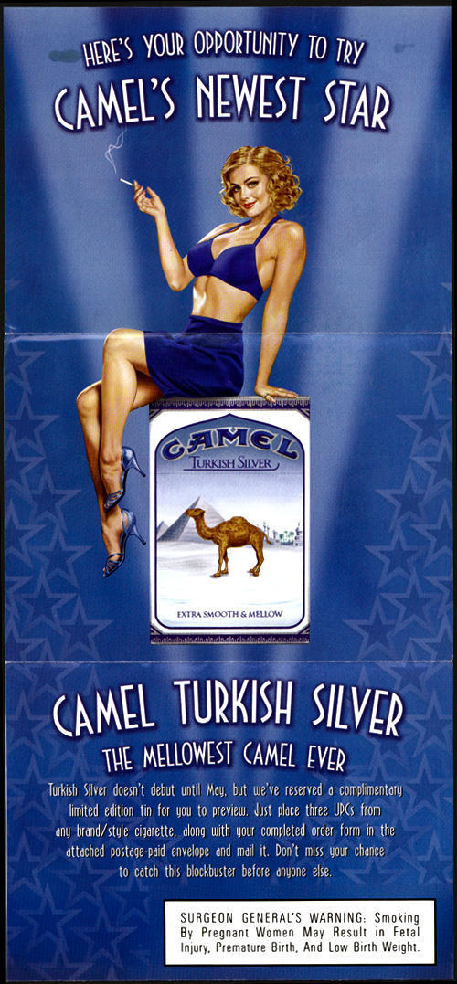 Direct mail from Camel in promotion of the upcoming release of a new blend - Camel Turkish Silver, "the mellowest Camel ever." Cover features a drawn image of an attractive blond woman smoking a cigarette while lying on what looks like a movie theater marquis. "You're invited to an exclusive sneak preview." Inside the piece is an image of the woman sitting on top of a Camel Turkish Silver pack. Text: "Here's your opportunity to try Camel's Newest Star Camel Turkish Silver, The Mellowest Camel Ever. Turkish Silver doesn't debut until May, but we've reserved a complimentary limited edition tin for you to preview. Just place three UPCs from any brand/style cigarette, along with your completed order form in the attached postage-paid envelope and mail it. Don't miss your chance to catch this blockbuster before anyone else." Also included in the piece are 5 coupons: 2x$4.00off one carton coupons, and 3x $2.00off two packs coupons.