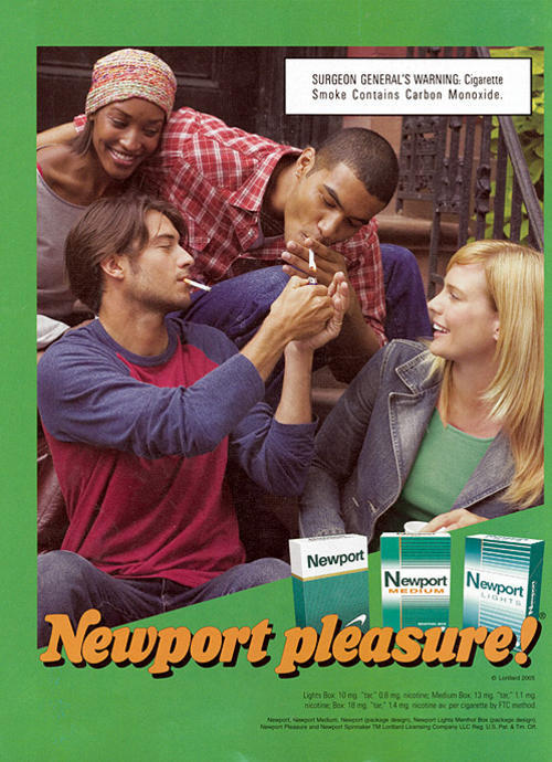 Ad for Newport cigarettes featuring four young people sitting on outside on steps hanging out and smoking cigarettes. One young man is shown smoking a cigarette while lighting a cigarette for the other male in the picture.