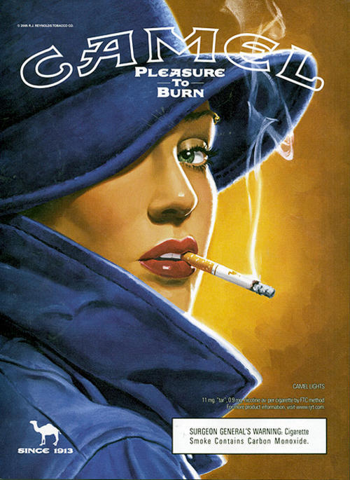 Ad for Camel cigarettes featuring a close up of a glamorous looking woman smoking a cigarette. Woman is wearing a blue hat that covers one eye and a blue coat or jacket with the collar pulled up. One eyebrow is pierced.