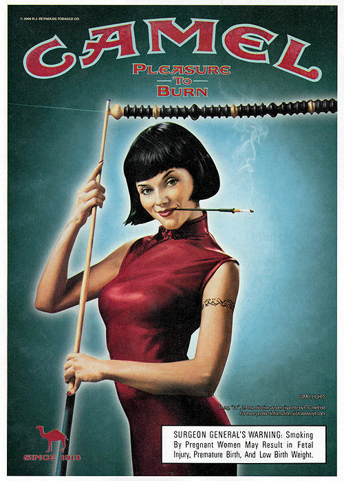 Ad for Camel cigarettes featuring a sexy image of a dark haired, tattooed woman, holding a pool stick and smoking a cigarette in a long cigarette holder.