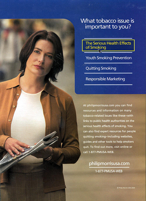 Ad from Philip Morris, promoting their website and phone number as a source of information on tobacco related issues such as quitting. Smaller text: "At philipmorrisusa.com you can find resources and information on many tobacco-related issues like these-with links to public health authorities on the serious health effects of smoking. You can also find expert resources for people quitting smoking - including websites, guides and other tools to help smokers quit. To find out more, visit online or call 1-8777-PMUSA-WEB."