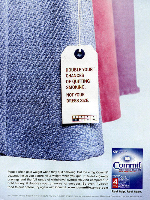 Ad for Commit stop smoking lozenge. Ad features an image of a dress tag with the following text: "Double your chances of quitting smoking. Not your dress size."