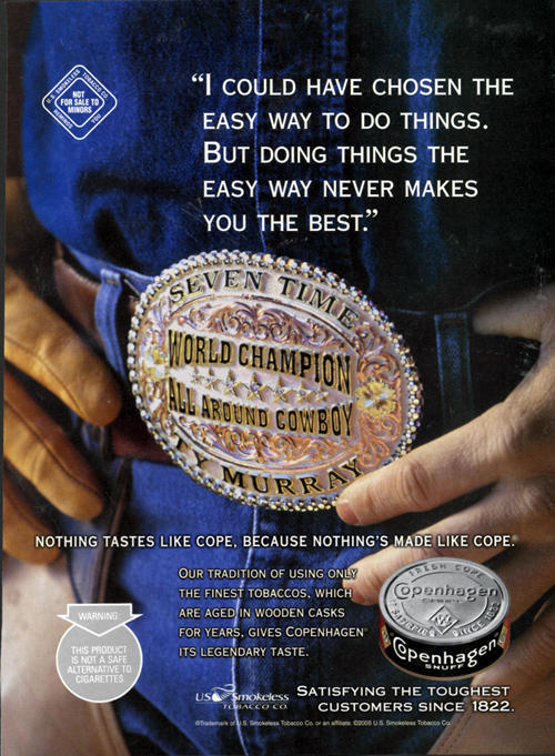 Ad for Copenhagen snuff. Ad features a close-up image of a Ty Murray's champion cowboy belt, which says: