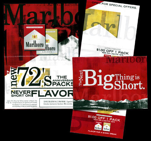 Text: "The next big thing is short." The 72s are shortened versions of Marlboro Reds and Lights cigarettes, in a shortened and more metallic looking pack. "New 72's The Anniversary Packs, Never Short on Flavor." The piece also came with 6 $1 off per pack of 72s coupons.