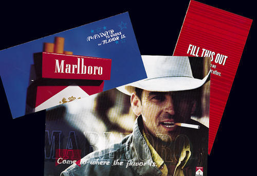 Direct Mail from Marlboro for coupons. Mailer piece is a large holder for coupons. one side features image of cowboy smoking with the text simply displayed, "Come to where the flavor is." Other side features grahic image of a Marlboro red pack that can be pulled out. Piece was received in late May of 2005. Included 3 $4.00-off-a-carton coupons and a customer information survey.