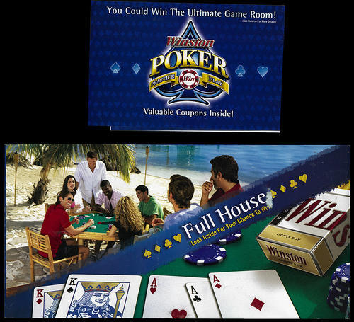 Direct mail from Winston in promotion of a card game ("Texas Hold 'Em) sweepstakes. Outer flap of the piece features a drawn image of a group of young adults playing cards on the beach. Inside, the piece illustrates different prizes available, including a 57" home theater, poker table and billiards table. Receivers can enter by playing the card game online, by entering the drawing online, or by sending in an enclosed entry card (which also acts as a customery survey). The piece also included 2 $1.00off-two-packs coupons, and 3 $4.00off a carton coupons.