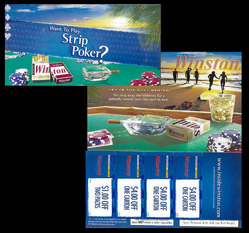 Direct Mail from Winston sent around May 2005. Cover features an image of pocker chips, and Winston cigarettes on a poker table at the beach. Text: "Want to play strip poker?" Inside are five "peel away" poker cards that reveal different messages. Receivers are instructed to "Strip away the cards to see what Additive Free Winston is dealing up for you." Piece also came with 1 $1.00off of two packs coupon, and 3 $4.00off a carton coupons.
