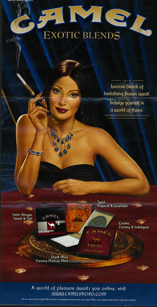 Direct mail from Camel received around March 2005 in promotion of the flavored Exotic Blends. The cover tells receivers to "Indulge in the exotic". Inside, an attractive exotic drawn model is sitting and smoking a cigarette in a long cigarette holder. In front of her is a platter of of four Exotic Blends flavors - Izmir Stinger, Twist, Crema and Dark Mint. "Luscious blends of tantalizing flavors await. Indulge yourself in a world of flavor." Readers are also invited to visit Camel's website: "A world of pleasure awaits you online". 4 coupons for $1.00off one pack are attached.