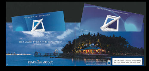 Direct mail piece received around October 2005, featuring an evening image of a bar or restaurant and several people at a pier. Piece includes a brand preference survey and coupons (one person received 6 $1.00 off per pack coupons, another person received 4 coupons: 2 x $1.00 off per pack and 2X $2.00off per pack coupons).
