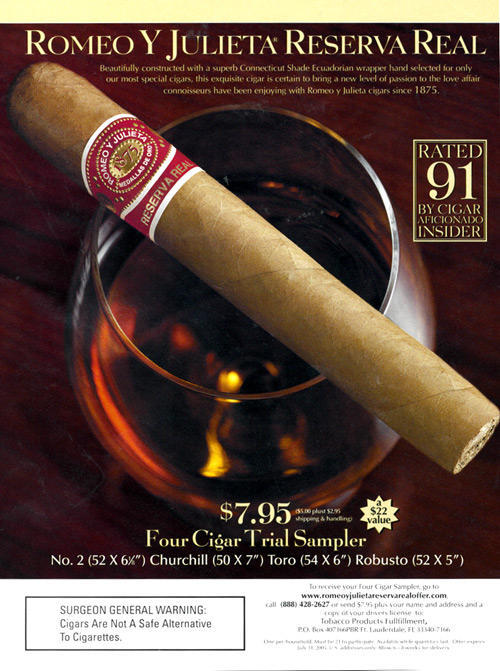 Ad for Romeo y Julieta cigars. Text: "Beautifully constructed with a superb Connecticut Shade Ecquadorian wrapper hand selected for only our most special cigars, this exquisite cigar is certain to bring a level of passion to the love affair connoisseurs have been enjoying with Romeo y Julieta cigars since 1875."