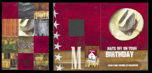 Direct mail birthday card from Marlboro. "Hats off on your birthday from your friends at Marlboro". Card includes $5.00 off one carton coupon.