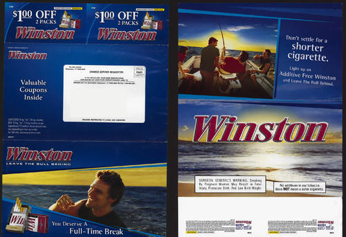 Direct mail from Winston. Cover features image of man smiling and smoking a cigarette. "You deserve a full-time break" Inside: "Don't settle for a shorter cigarette. Light up an Additive Free Winston and Leave the Bull Behind." Same man is now featured with friends on a boat at sunset. 2 coupons for $1.00 off two packs are included.