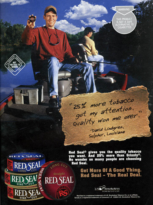Ad for Red Seal smokeless tobacco featuring two men on a fishing trip promoting the value over Red Seal, especially compared to Grizzly. Text: "25% more tobacco got my attention, Quality won me over" "Red Seal gives you the quality tobacco you want. And 25% more than Grizzly. No wonder so many people are choosing Red Seal."