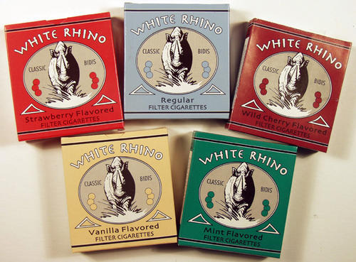 Collection of different flavors of White Rhino bidi cigarettes. These bidis are available in wild cherry, vanilla, mint and strawberry flavors.
