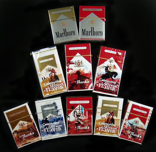 Group shot of Marlboro's 50th anniversary themed packs. In late 2004, regular packs of Marlboros began appearing with special wrapping paper, featuring various images of Marlboro’s iconic cowboy and anniversary related phrases such as, “Celebrating 50 Years of Flavor” and "Thanks". For its anniversary, Marlboro then introduced a new version of its Reds and Light cigarettes – the “72’s”. These shortened cigarettes come in smaller more metallic looking packs and are currently promoted as the anniversary packs of Marlboro’s 50th celebration. Philip Morris began shipping the 72’s in January 2005.