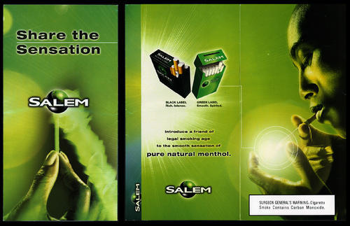 Direct mail from Salem received around August 2005 promoting receivers to encourage friends to sign up. Cover features a hand holding a match, which intersects with the Salem logo. "Share the sensation". Inside the brochure: "Isn't it time you let a friend experience all that Salem has to offer? Introduce a friend of legal smoking age to the smooth sensation of pure natural menthol. Now there are two easy ways your friend can enter the world of Salem. 1. Have them fill out the card below and mail it back to Salem. 2. Logon to salemaccess.com and click on 'share the sensation'." The piece includes postcard with brand preference questions for friends to use to sign up. Also includes 4 coupons (2x $4.00off one carton, 2x $1.00off two packs).