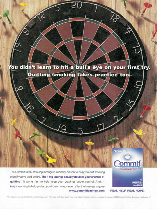 Ad for Commit Lozenge Stop Smoking Aid, featuring a new blue package design. Picture of a dartboard with the text, "You didn't learn to hit a bull's eye on your first try. Quitting takes practice too."