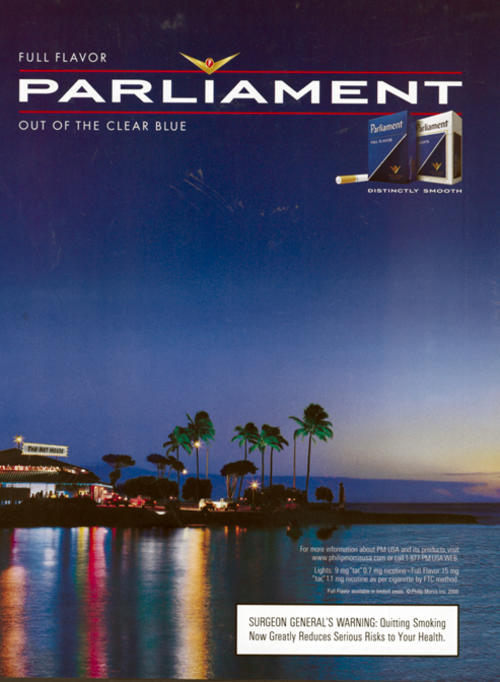 Ad for Parliament cigarettes featuring an image of a bar or restaurant by the pier in the evening. Text: "Out of the clear blue"