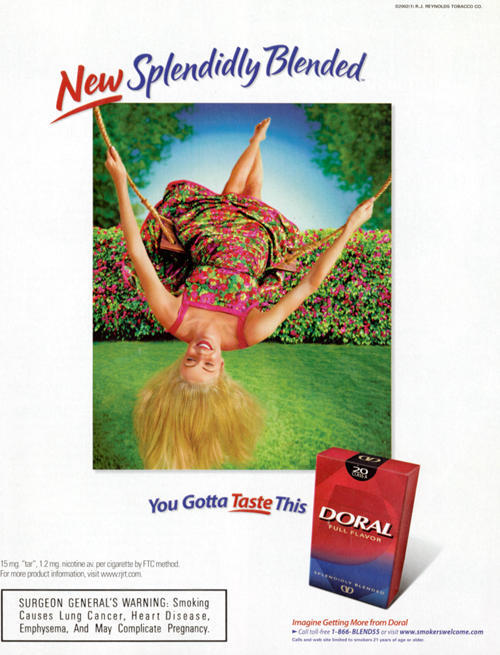 Ad for Doral cigarettes featuring an image of a girl on a swing. "New Splendidly Blended. You Gotta Taste This" Ad found in Family Circle, March 12, 2002.
