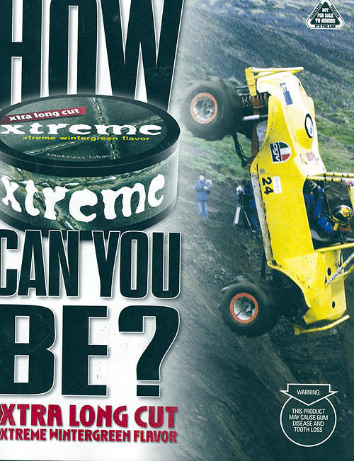 Ad for Xtreme chew tobacco in wintergreen flavor. "How xtreme can you be? Extra long cut xtreme wintergreen flavor"