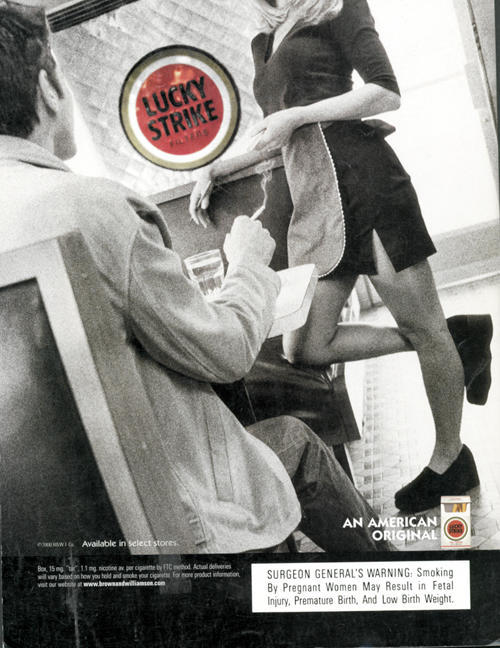 Ad for Lucky Strike cigarettes, featuring an image of a man smoking at a diner, having his order taken by a female waitress. "An American Original" Found in Real Edge, January 2000; a controlled circulation magazine of the former Brown and Williamson Tobacco Co.
