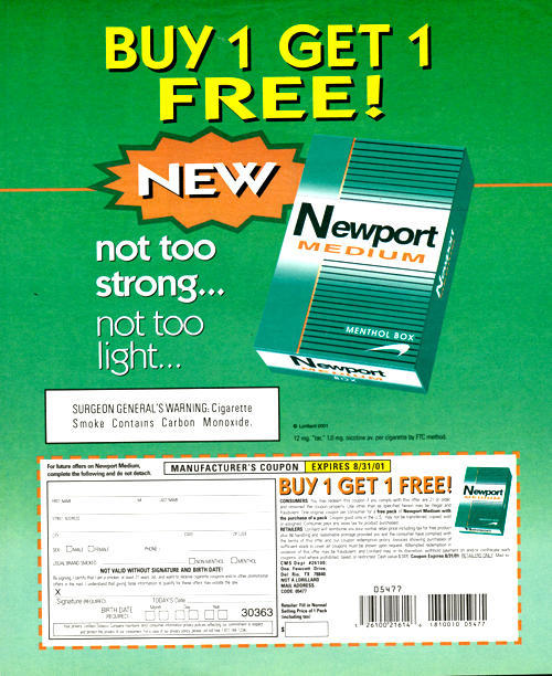 Newport Ad in promotion of its new blend, Newport "Mediums" as well as its "Buy 1 Get 1 Free" offer. Ad included coupon for the offer as well as a mean to sign up for future offers (ie, direct mail).