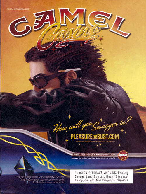 Camel ad in promotion of Camel's online program, the "Camel Casino". Ad features a drawn image of a man seemingly driving (a motorcycle). "How will you swagger in? Pleasureorbust.com"