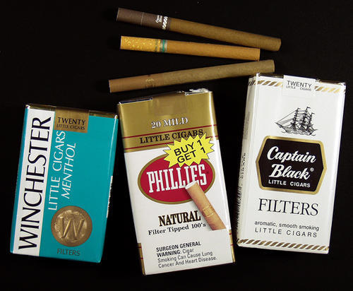 Group shot of little cigar packs from Winchester, Phillies, and Captain Black.