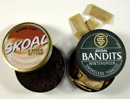 Snuff tobacco from Skoal. Vanilla flavored long cut Skoal on the left, and Wintergreen flavored Skoal "bandits" on the right.