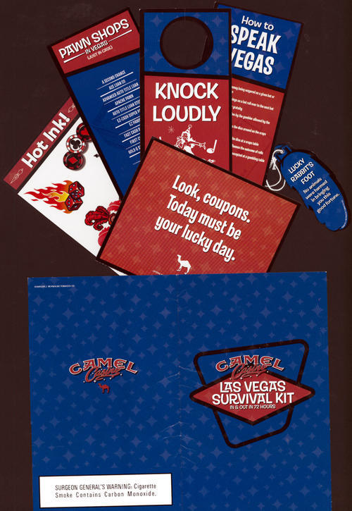 Direct mail piece in promotion of the "Camel Casino" program. Piece is called a "Las Vegas Survival Kit" and includes a "do not disturb" doorhanger, a bookmark of gambling related "terms", a list of pawn shops ("just in case" they are needed, and a sheet of temporary tattoos. Also included is a code for redeeming 10 chips at the online Camel Casino, to be used for online gambling. Text: "Time is of the essence. You've got 72 hours. Any more and you might lose your mind. Any less and you'll be craving more. Don't believe us? Try it yourself. Your chance to plan and win your own three-day stint in Sin City is waiting at pleasureorbust.com"