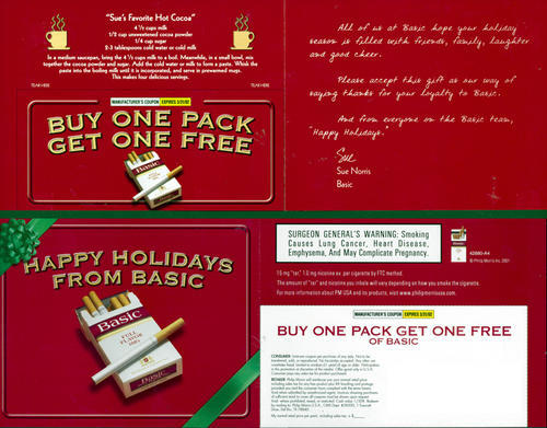 Holiday themed direct mail from Basic. "Happy Holidays from Basic". Piece comes with a recipe for hot chocolate and two "buy one pack get one free" coupons as a "holiday gift"