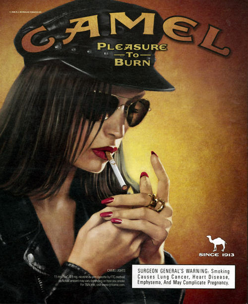 Ad for Camel cigarettes featuring a drawn image of an attractive woman wearing sunglasses and a leather hat and jacket, and lighting a cigarette.