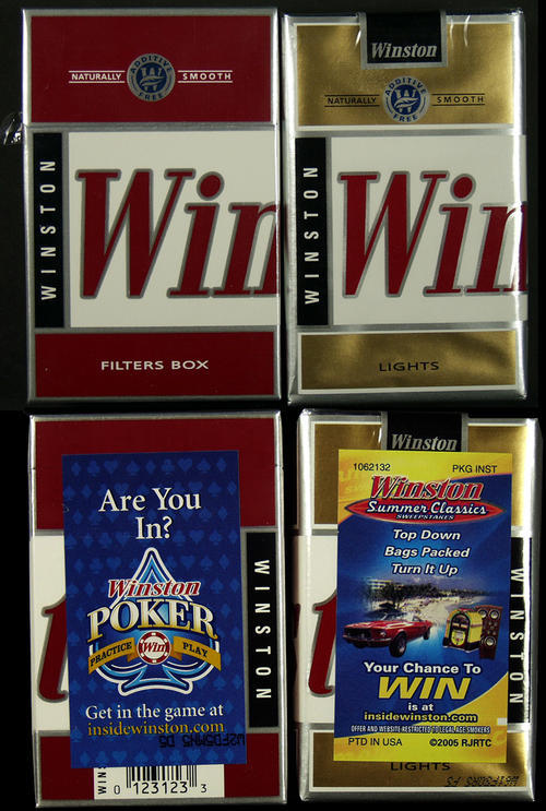 Pack of Winston filters and Winston Lights packed with inserts advertising Winston's website and promotions. On the left, Winston's online Poker promotion is advertised and on the right, Winston's summer classics sweepstakes is advertised.