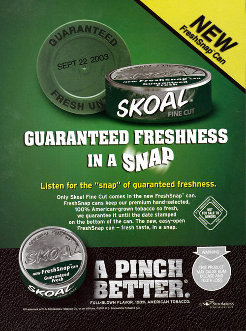 Ad for Skoal snuff tobacco, promoting the fresness of the can. "Guaranteed freshness in a snap. Listen for the 'snap' of guaranteed freshness. Only Skoal Fine Cut comes in the new FreshSnap can. FreshSnap cans keep our premium hand-selected, 100% American-grown tobacco so fresh, we guarantee it until the date stamped on the bottom of the can. The new, easy-open FreshSnap can - fresh taste, in a snap."