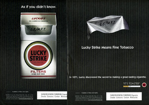 2 page ad for Lucky Strike cigarettes. "As if you didn't know." "Lucky Strike means fine tobacco."