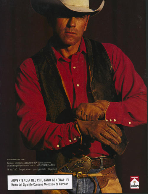 Marlboro ad featuring a close up image of a cowboy who appears to be adjusting his gloves.