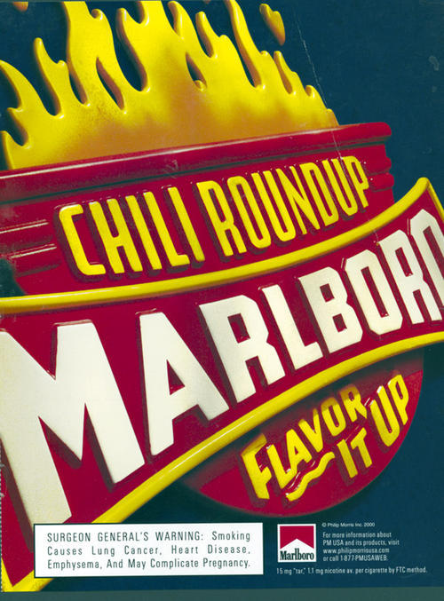 Ad in promotion of Marlboro's "Chili Roundup Contest", where readers are encouraged to send in and enter their best chili recipe. Grand prize includes a car and $2000.