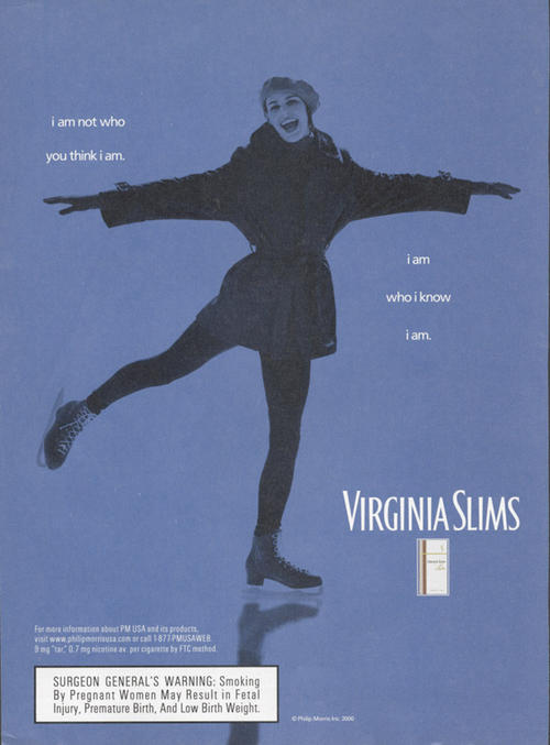 Ad for Virginia Slims featuring an image of a woman ice skating. "I am not who you think I am. I am who I know I am."