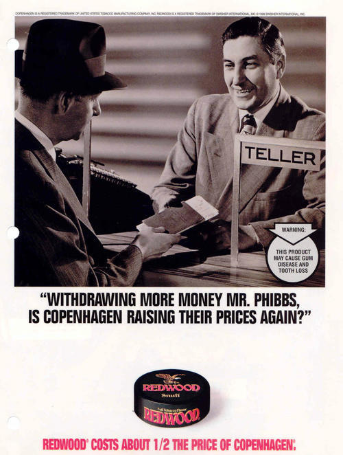 Redwood chew tobacco ad featuring an image of a man at a bank. "Withdrawing more money Mr. Phibbs, is Copenhagen raising their prices again?" "Redwood costs about 1/2 the price of Copenhagen"