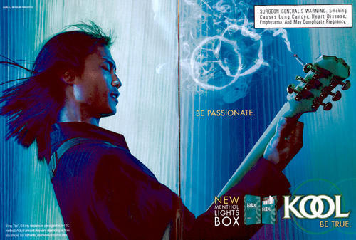 2 page KOOL ad, in promotion of the "Be True" campaign, and the new menthol lights box. The ad features an image of an Asian man playing guitar. His lit cigarette is tucked into the strings of the guitar and has created swirls of smoke. Text:"Be Passionate"
