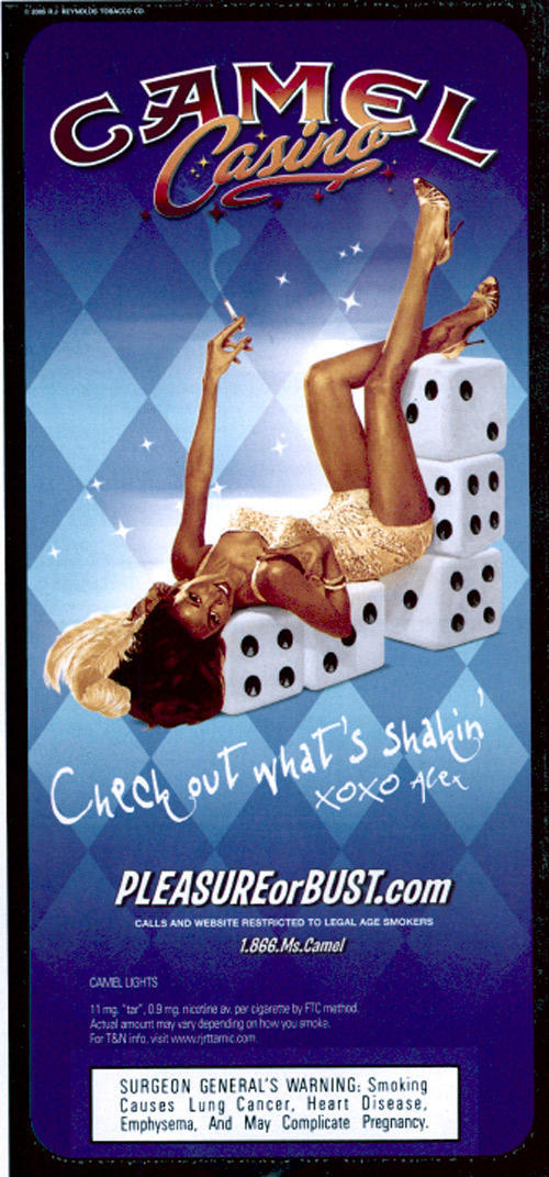 2/3rd page Camel ad in promotion of the "Camel Casino". This ad features an image of "Alex", one of the "Camelette" women promoted in this campaign. The drawn woman is featured in a glamourous dress and lying on oversized dice.