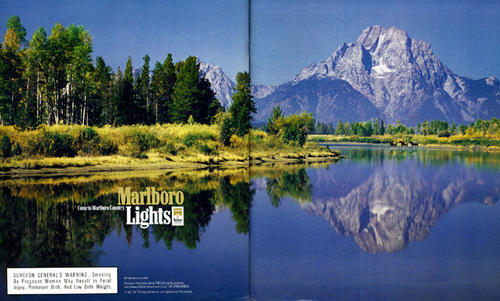 2 page ad for Marlboro Lights featuring a landsccape of a mountain and a body of water.