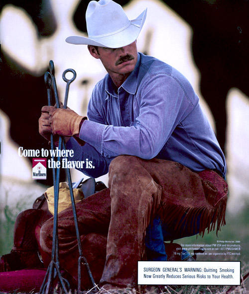 Ad for Marlboro featuring an image of a cowboy holding metal prods.
