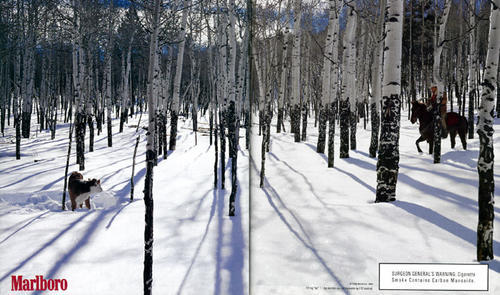 2 page ad for Marlboro featuring an image of a snowy forest with a man on his horse and a dog in the snow. Found in the Winter 2000 issue of Unlimited Magazine, Marlboro's controlled circulation magazine.