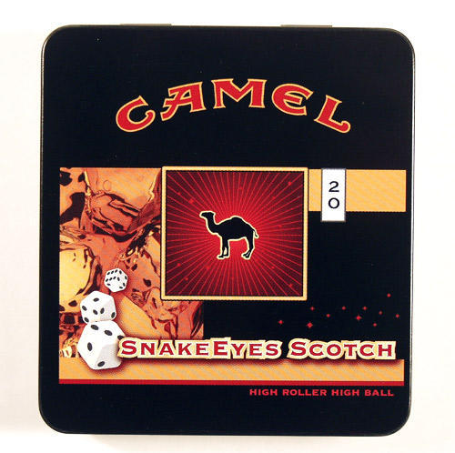 Camel "SnakeEyes Scotch" flavored Exotic Blends cigarettes. These cigarettes were introduced in the Fall of 2005 along with two other alcohol flavored cigarettes in the same "High Roller High Ball" series: Blackjack Gin and Screwdriver Slots. These special/limited time only blends fall in line with the "Camel Casino" campaign run during the same time period. The following text is found inside the tin: "Not all cigarettes are rolled equally. With a kiss of dark flavor and a smooth finish, SnakeEyes Scotch is a lucky roll."