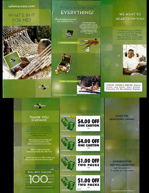 Direct mail piece from Salem in promotion of Salem's brand website. Text on cover says: "www.salemaccess.com What's in it for you"