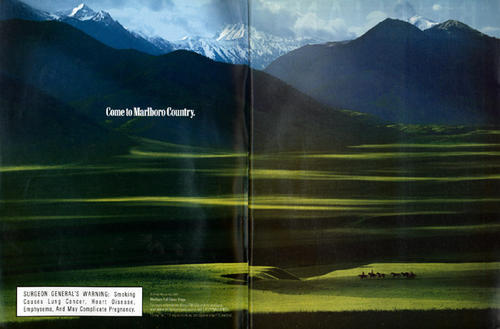 2 page ad for Marlboro, featuring an image of several cowboys and horses in a large green and mountain landscape. Found in the March 8-15, 2001 issue of TimeOut (issue no. 285)