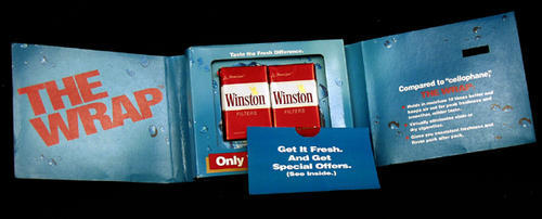 Package promoting wrapping type which is exclusive to Winston brand cigarettes. Package comes with two packs of plain cigarettes.