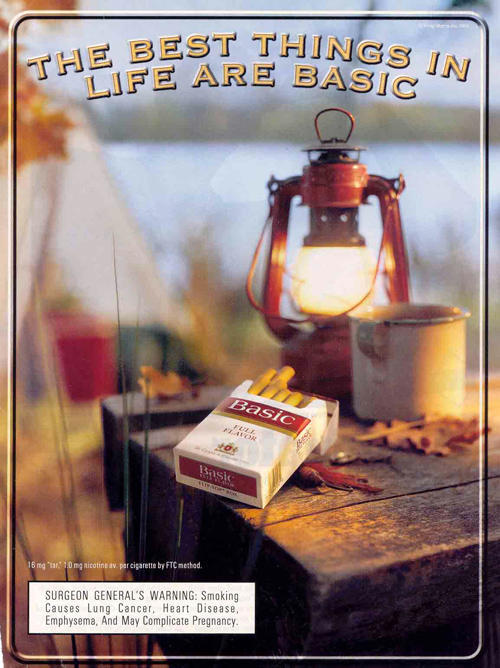 Ad for Basic cigarettes, featuring an image of the pack on an outdoor table. "Keep it Basic".